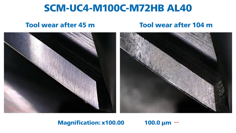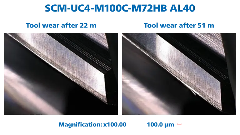 We subjected our four-cutting-edge end mills to a performance test on different materials and measured the width of the flank wear after the tool was in cut for a defined period of time.