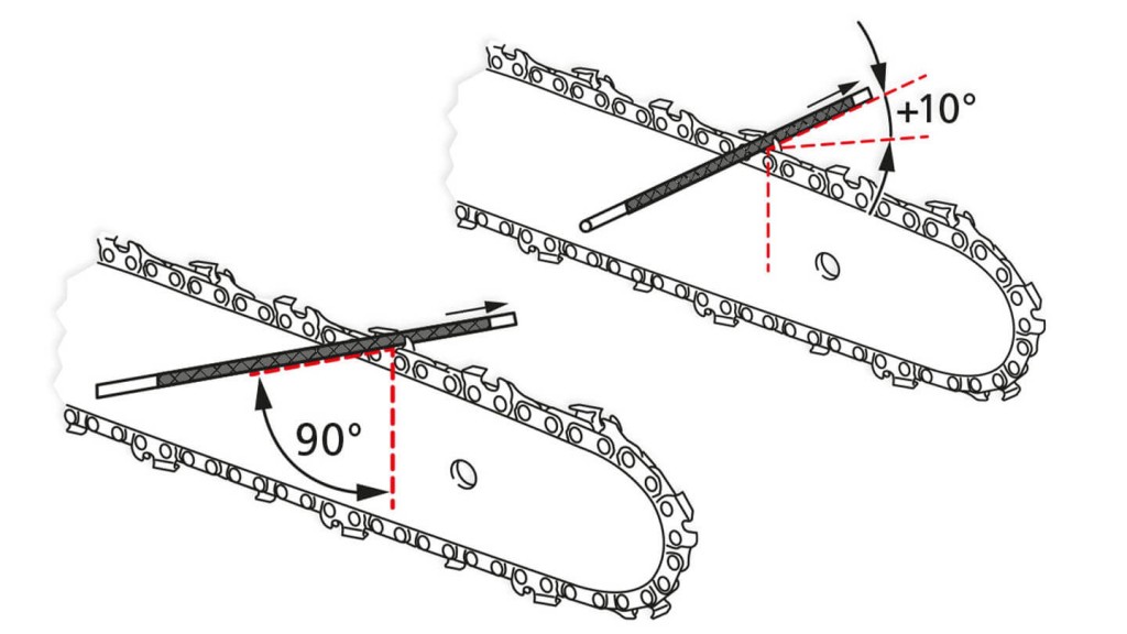 Selon le type de chaîne ou de dent et les recommandations du fabricant, la lime est guidée horizontalement (= 90°) par rapport au guide-chaîne ou avec une inclinaison de + 10°. L’angle d’affûtage peut également varier.