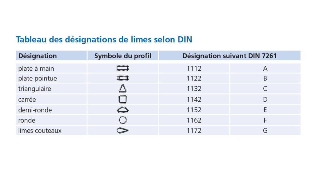 Les désignations des profils de limes sont définies par la norme DIN 7261. Le diaporama ci-dessous vous les présente en un coup d’œil :