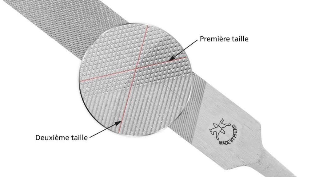 Exemple :Sur une lime de 250 mm de longueur et de taille 1, 9 dents sont réparties sur 1 cm de longueur de lime, tandis que sur une lime de 100 mm de longueur et de taille 1, 17 dents sont réparties sur 1 cm. La répartition d’un nombre de dents plus élevé sur les limes plus courtes permet de garantir un confort de travail semblable (force appliquée, facilité de guidage et enlèvement de matière) sur les surfaces et les arêtes.