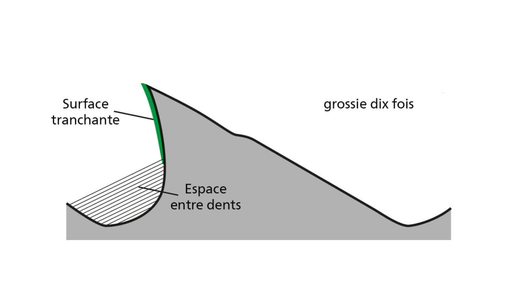 Contrairement aux limes taillées, les dents des limes fraisées sont taillées dans le matériau plein. Chaque dent est formée de telle manière que le copeau s’enroule devant la surface tranchante arrondie et trouve place dans le grand espace entre dents.